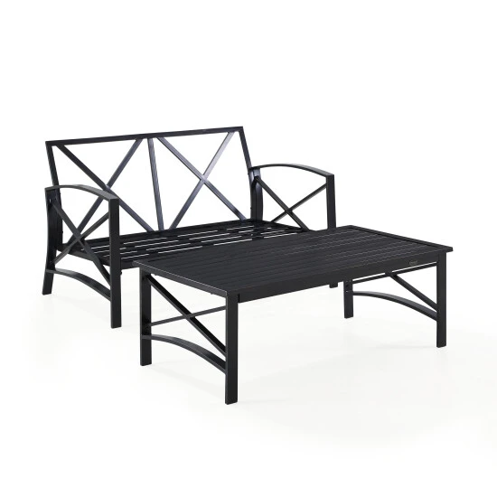 Add simple elegance to your outdoor area with the Kaplan Collection. This two-piece set is made with rust protected premium steel with an oil bronze finish. The cushions have a moisture-resistant and UV-resistant cover to protect against fading. This set includes a loveseat and a coffee table. It is easy to assemble and even easier to enjoy.
