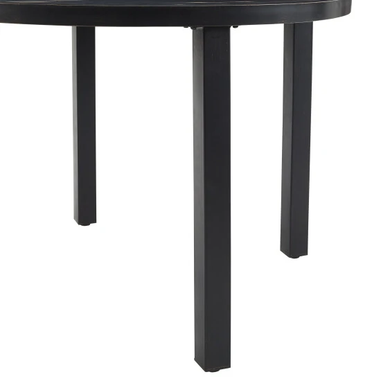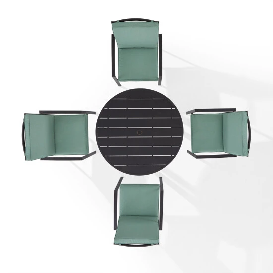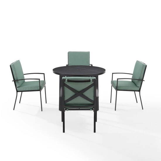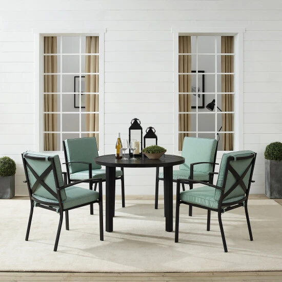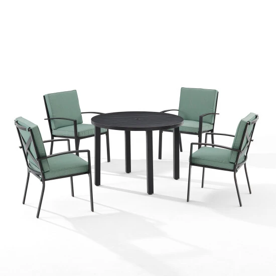 Gather around the Kaplan 5pc Round Dining Set for a cozy meal al fresco. The round table features a slatted design that elevates the sturdy steel construction creating a perfect partner to the four outdoor dining chairs. Each chair showcases comfy back and seat cushions plus a classic x-back design. The table has a standard umbrella hole that will allow you to add some shade on a hot summer day. Simple and stunning, the Kaplan 5pc dining set will be a welcome addition to your outdoor entertaining.Features:Transitional designConstructed of sturdy weather-resistant steelOil-rubbed bronze finishOatmeal cushion coversMist cushion coversX-back chair designHigh-performance solution-dyed polyester cushion covers resist mildew, sun fade, and abrasionMoisture-resistant high grade cushion coresRemovable cushion covers are machine washableThe cushions have a thickness of 2.375″The cushions are secured with sturdy Velcro tabs for easy removalUnique slatted tabletopStandard umbrella hole in table measures 1.97″ in diameterUmbrella hole cover sits flush with the tabletopAdjustable levelers on table legsTable weight limit is 100lbsChair Dimensions – 24.75″W x 24.75″D x 37″HTable Dimensions: 41.75″W x 41.75″D x 29.75″H