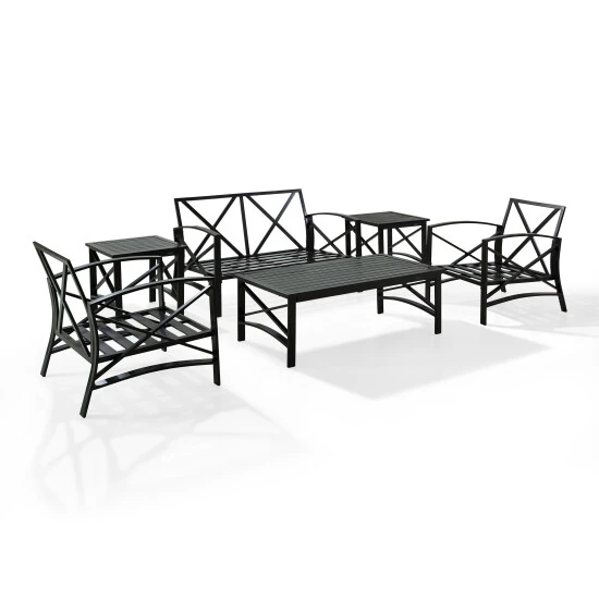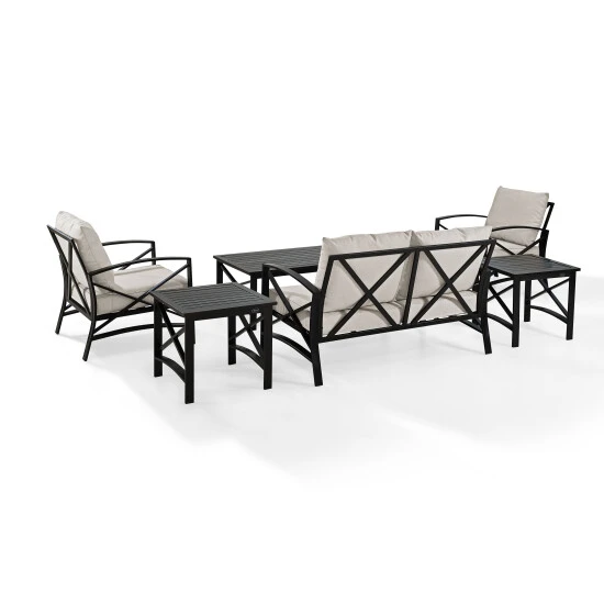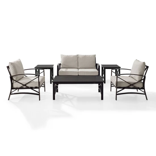 Add simple elegance to your outdoor area with the Kaplan Collection. This six-piece set is made with rust protected premium steel with an oil bronze finish. The cushions have a moisture-resistant and UV-resistant cover to protect against fading. This set includes two chairs, a loveseat, a coffee table, and two side tables. It is easy to assemble and even easier to enjoy.