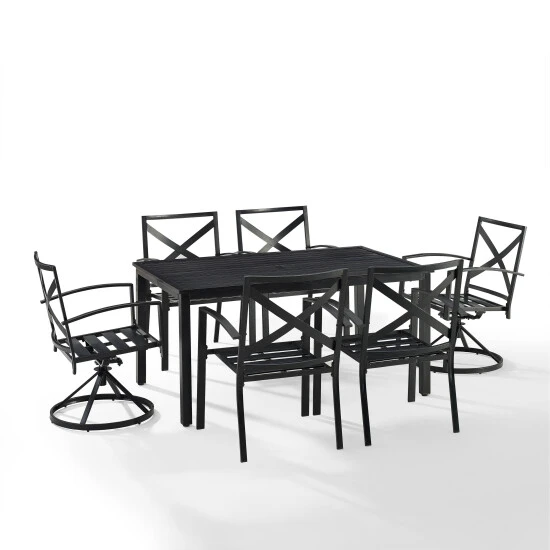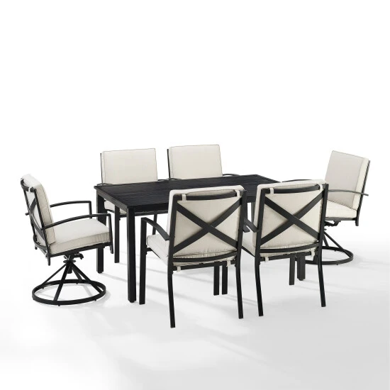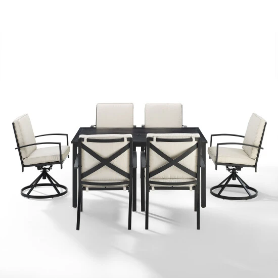 Enjoy family meals, game nights, and more outside with this stylish patio dining set from Crosley Furniture. Part of the Kaplan collection, this set includes a rectangular table, four stationary dining chairs, and two 360-degree swivel chairs. Made of weather-resistant steel with plush, weather-resistant cushions, this set is designed to last outside.