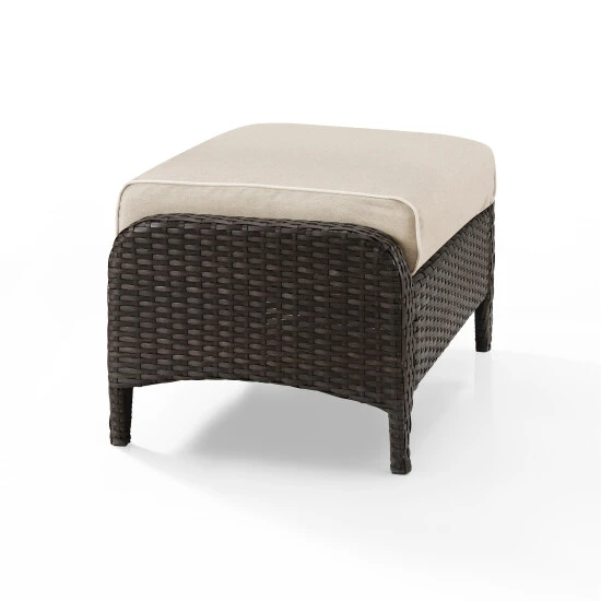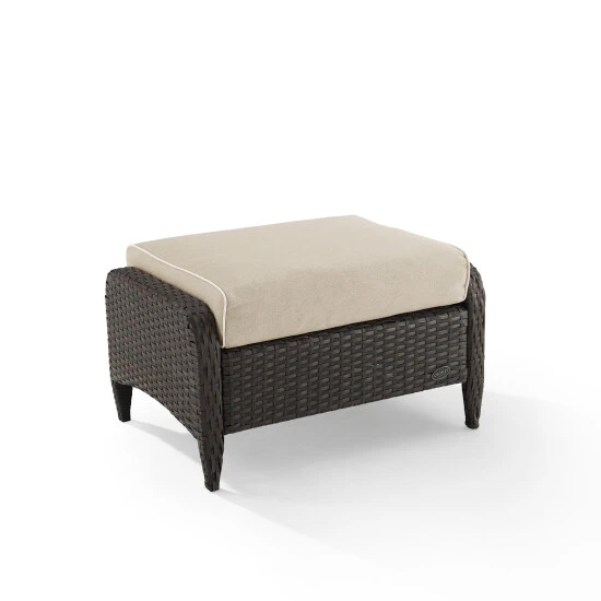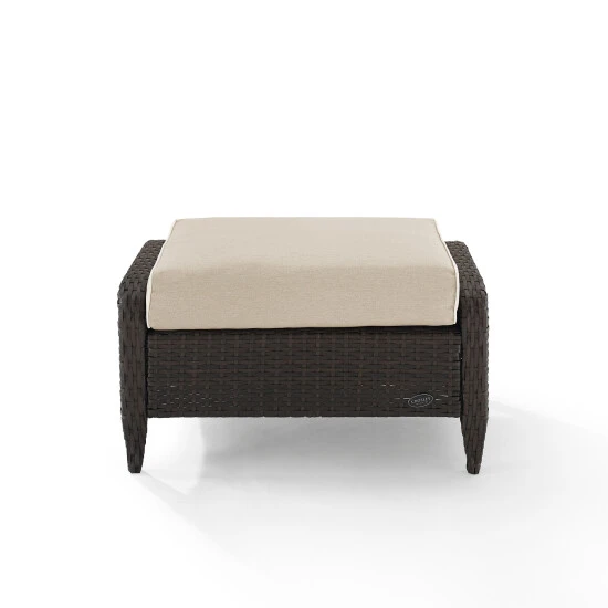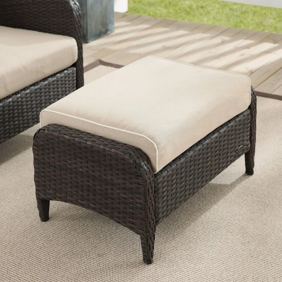 You’ll be ready to prop your feet up and relax with the Kiawah Ottoman. The plush piped cushion and stylish design make this ottoman an ideal partner to a variety of outdoor seating. A durable powder-coated steel frame is surrounded by elegantly woven all-weather wicker that provides comfort and durability. – Transitional design – Brown reed-style flat wicker – UV resistant outdoor resin wicker – Durable powder-coated steel frame – Neutral sand colored cushion covers with white piping – Moisture-resistant high grade cushion cores – Weather-resistant solution dyed polyester cushion covers
