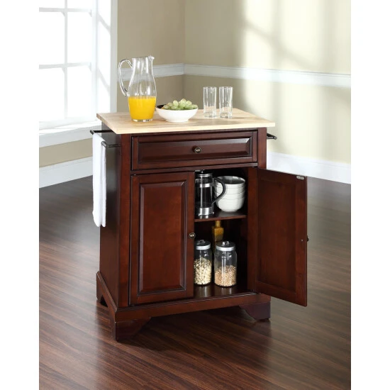 Constructed of solid hardwood and wood veneers, this kitchen island is designed for longevity. The beautiful raised panel doors and drawer front provide the ultimate in style to dress up your kitchen. The deep drawer are great for anything from utensils to storage containers. Behind the two doors, you will find an adjustable shelf and an abundance of storage space for things that you prefer to be out of sight. Style, function, and quality make this kitchen island a wise addition to your home.