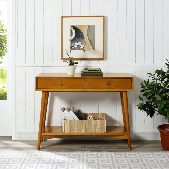 Add some swanky style to your home with the Landon Console Table. This mid-century inspired design is accented with genuine metal hardware and the solid hardwood is finished in warm acorn. This piece is perfect for storing away odds and ends within the two full-extension, pullout drawers, and for displaying collectibles and décor on the planked shelf. This table is a stylish addition to your entryway, living room, or bedroom.
