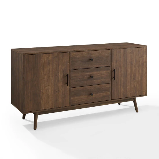 The Lucas Sideboard showcases mid-century modern design at its best. Featuring two spacious cabinets with adjustable shelves, this console stores anything from dishes to precious vinyl. Three deep storage drawers at the center of the console sit on smooth rolling metal glides, while the spacious top is the perfect perch for your favorite record player. The clean lines of the Lucas Sideboard offer simple elegance and versatility, perfect for any room of your home. – Mid-century modern design – Genuine metal hardware in a matte black finish – Two cabinets with adjustable shelving and magnetic closures – Three deep storage drawers on metal roller glides – Tapered legs – Ideal for use as a dining sideboard or media storage – Pairs well with modern farmhouse and rustic décor