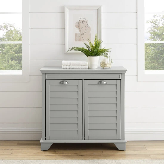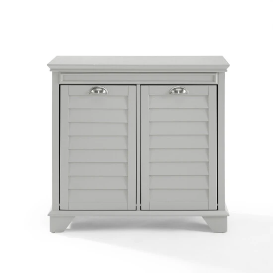 With styling that compliments any décor, the Lydia Linen Hamper features a compact footprint suitable for any size bathroom, laundry room, or hallway. Dual hampers provide a head start on the sorting and the removable cloth bags transport loads to the washer in a snap. A clever pull-forward design provides easy access to both compartments, making the Lydia Linen Hamper a great laundry solution for your home. – Coastal cottage design – Gray finish – Genuine metal hardware in a brushed nickel finish – Sorting compartment pulls forward for easy access – Two compartments for easy sorting – Removable cloth bags – Solid cabinet doors with faux-louvered accents – Pairs well with transitional or traditional decor