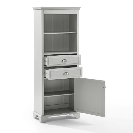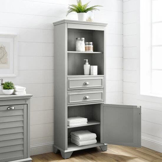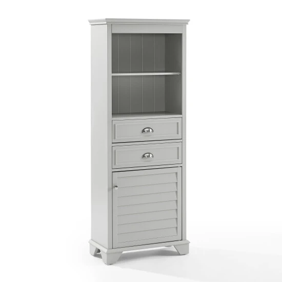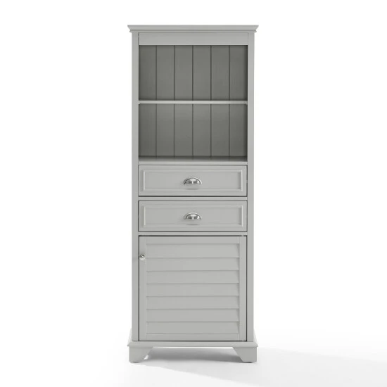 Bring order to your chaos with the Lydia Tall Cabinet. This tall cabinet was conceived to maximize storage space, in a style that embraces a classic cottage aesthetic. Featuring open shelving with beadboard detailing and two spacious drawers, this cabinet offers a variety of storage options. The large cabinet at the base of the unit features an adjustable shelf and a stylish louvered design on the door. The Lydia Tall Cabinet has everything you need to craft a tidy and organized living space. – Coastal cottage design – Gray finish – Genuine metal hardware in a brushed nickel finish – Adjustable shelf inside cabinet – Two deep storage drawers – Beautiful faux-louvered door – Adjustable open shelf – Pairs well with transitional or traditional decor