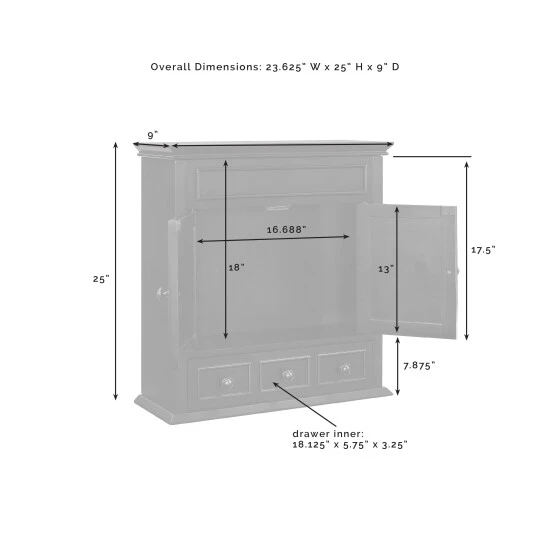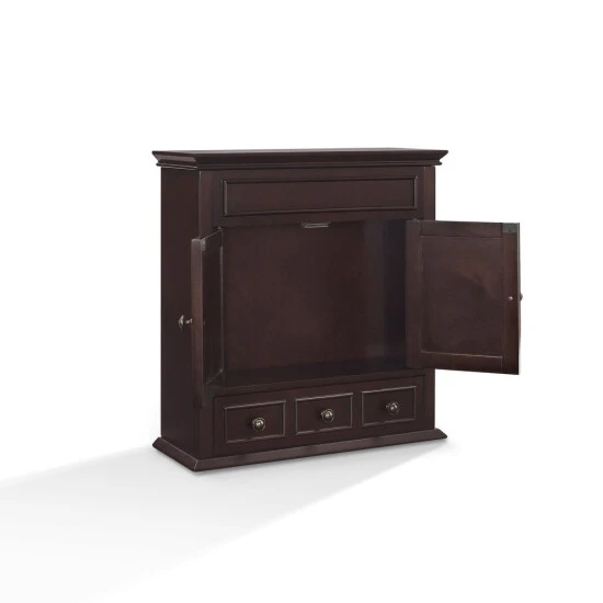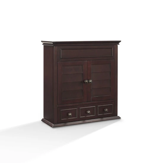 Store extra washcloths, toilet tissue, and cotton balls in this wall cabinet. Featuring a solid wood, genuine metal hardware, and veneer construction, the cabinet is durable and sturdy enough to affix to the wall. The unit provides space in a cabinet and a drawer to get organized more easily.