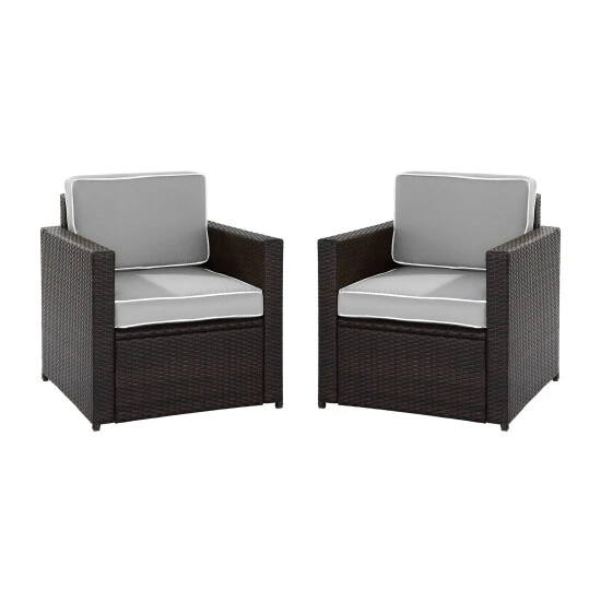 Enjoy an intimate chat with a friend with this two-piece wicker outdoor set by Palm Harbor. Featuring four neutral-colored cushions with a white corded outline, these chairs offer a classic look to complement your other deck furnishings. This armchair set boasts all-weather wicker to stand up to the elements.