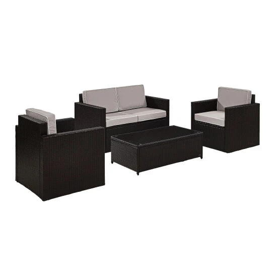 Kick back and relax with this outdoor seating set from Crosley Furniture. Steel framing and intricately woven wicker provide long-lasting enjoyment and traditional styling, while grey fabric cushions ensure exceptional comfort that resists fading from UV rays. The two arm chairs, loveseat, and cocktail table with tempered glass top provide ample seating for guests.