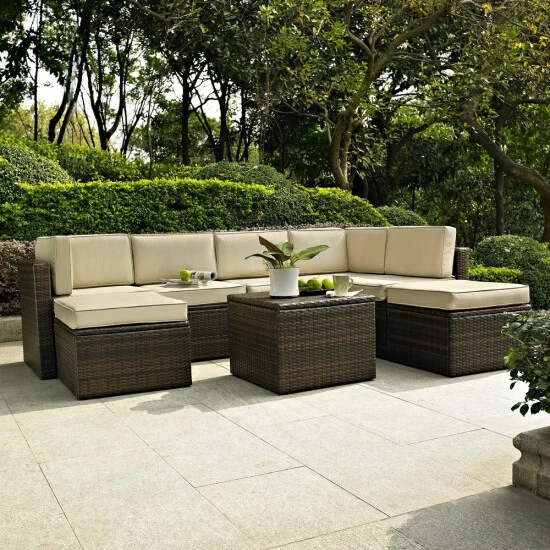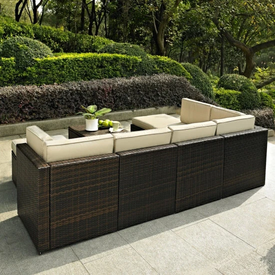 Enjoy entertaining outside with our elegantly designed all-weather outdoor resin wicker sectional set. This finely crafted collection features intricately woven wicker over durable steel frames and UV/Fade resistant cushions providing both comfort and style. This set is sure to provide lasting enjoyment in any outdoor setting. Includes two corner chairs, three center chairs, two ottomans and coffee sectional table.