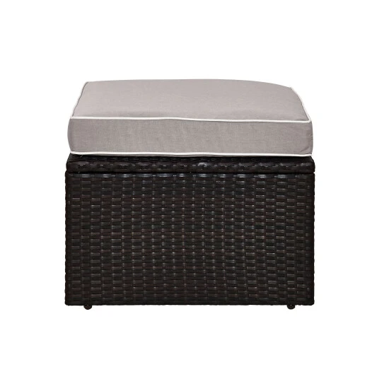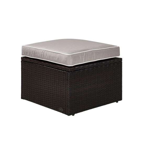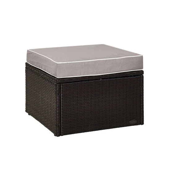 Create a soft spot to rest your feet while relaxing outside with this Palm Harbour ottoman with grey cushion. Featuring steel frames for structural sturdiness, this ottoman is wrapped in wicker for a casual vibe. This ottoman is brown in color for neutral charm, and the cushion is UV- and fade-resistant for lasting vibrancy in sunlit spaces.