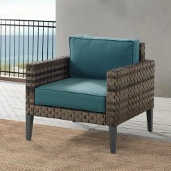 Offering a modern take on classic wicker, the Prescott Armchair is a great addition to your at-home retreat. Resistant to the whims of mother nature, this chair features all-weather resin wicker woven over a powder-coated steel frame. The wide wicker is beautifully weathered and has the textured feel of natural fiber. Topped with deep, moisture-resistant cushions, the Prescott Armchair will be your favorite place to relax in the sun.Features:Modern designUV resistant all-weather flat wide resin wickerWeather-resistant powder-coated steel frameHandwoven multi-tone brown resin wicker with a weathered natural textureDue to the multi-tone wicker, color variation among pieces should be expected, and enhances the character of the productMineral blue cushion coversTaupe cushion coversQuick-drying olefin fabric cushion covers resist mildew and sun fadeMoisture-resistant high grade cushion coresRemovable cushion covers are machine washableSteel tapered legs in a dark brown finishAdjustable levelers on legs