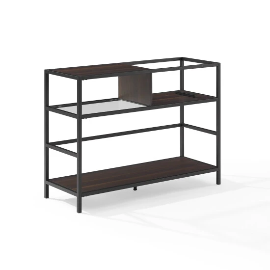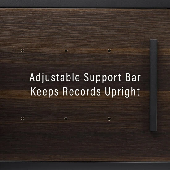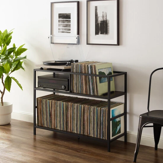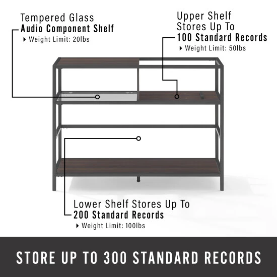 The Provo Record Storage Console offers a sleek, modern design. Combining the look of beautiful woodgrain and metal, this console has dedicated space for audio components, records, and your favorite turntable. With your record player at the ready, you can dip into your favorite LPs from the top shelf that adjusts to hold up to 60 standard albums or do a deeper dive on the bottom shelf which holds up to 120 more. Create your own private listening room with this all-in-one media stand.Features:Modern designBrown, faux wood grain finishMatte black finish on frameThe top of the console can fit most standard turntablesTempered glass shelf for audio components with a weight limit of 20lbsThe top shelf fits up to 100 records and has a weight limit of 50lbsThe adjustable support bar on the top shelf keeps your vinyl collection upright and tidyThe lower shelf holds up to 200 records with a weight limit of 100lbsAdjustable levelers on legsPairs well with mid-century modern and modern farmhouse decorConsole top weight limit is 50lbs