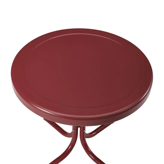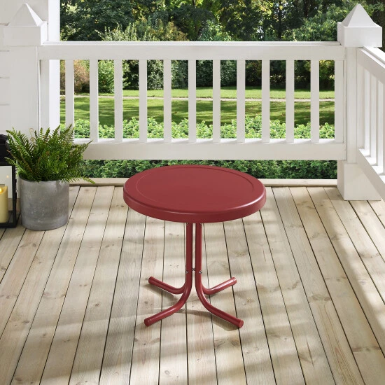 Relax outside for hours on our nostalgically inspired metal outdoor furniture. Set down your glass of iced tea on this sturdy steel side table, designed to withstand the hottest of summer days and other harsh conditions.