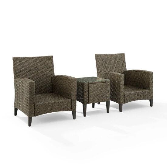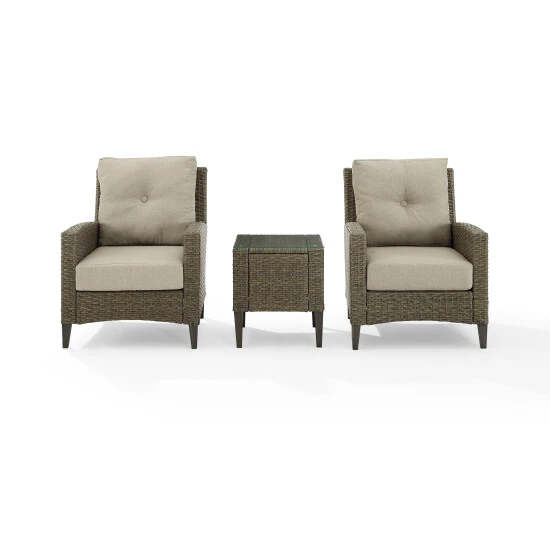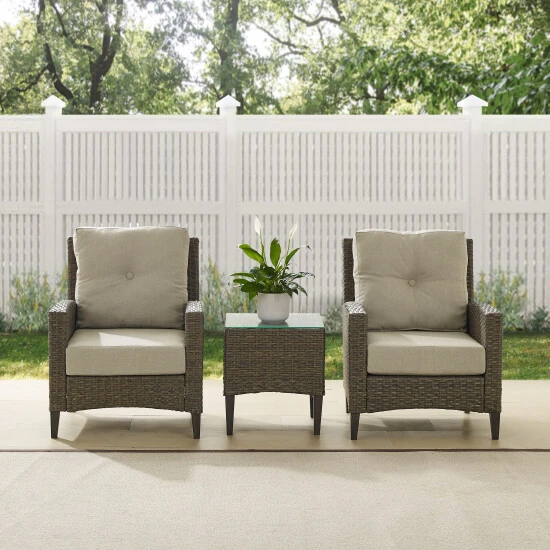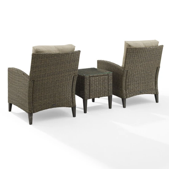 Lounge outdoors in classic style with the Rockport 3pc Chair Set. With high seat backs and plush cushions, this set is built from all-weather resin wicker handwoven over a powder-coated steel frame. The chair cushions are covered in moisture-resistant olefin fabric. Topped with tempered glass, the side table adds just the right amount of space for resting a cool drink. Each piece features unique tapered legs made of sturdy steel that are hand-painted to look like real wood. Prop up your feet and relax in the comfort and durability of the Rockport 3pc Chair Set.Features:Traditional designUV resistant all-weather reed style flat resin wickerWeather-resistant powder-coated steel frameHandwoven light brown resin wickerOatmeal cushion coversQuick-drying olefin fabric cushion covers resist mildew and sun fadeMoisture-resistant high grade cushion coresBack cushions feature a single button tuft5.75″ thick seat cushion and 4.75″ thick back cushionSteel tapered legs are hand-painted, offering a natural wood look with better durability than traditional wood furnitureAdjustable levelers on legsTempered glass tabletopTable weight limit is 100lbsSeating for up to twoArmchair Dimensions: 37.5″H x 30.5″W x 28″DSide Table Dimensions: 20″W x 20″D x 22.25″H