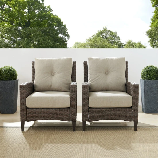 Lounge outdoors in classic style with the Rockport 2pc Chair Set. With high backs and gently arched arms, this outdoor wicker chair set is built from all-weather resin wicker over powder-coated steel frames. Plush seat and back cushions covered in olefin fabric offer durable comfort, while the unique tapered legs are made of sturdy steel painted to look like real wood. The Rockport 2pc Chair Set is designed with your comfort in mind.- Transitional design – UV resistant outdoor resin wicker – Durable powder-coated steel frame – Light brown reed-style flat wicker – Quick-drying olefin fabric cushion covers – Oatmeal colored cushions – Back cushions feature a single button tuft – Back cushion is 4.75″ thick and seat cushion is 5.75″ thick – Cushion covers can be removed for easy cleaning – Steel tapered legs painted with a faux wood finish improve the durability of the furniture –