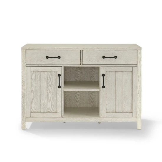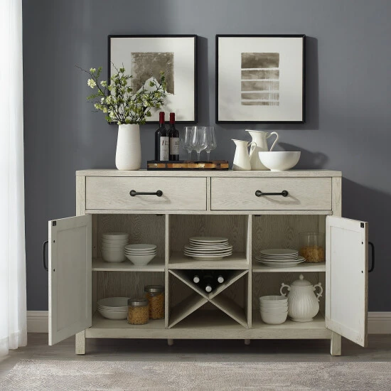 Reorganize your wining and dining essentials with the rustic Roots sideboard. The white-washed wood frame is hand-finished and fitted with two cabinets, two drawers, and an open shelf. Wine storage offers a way to display your favorite bottles, and the spacious tabletop is a perfect way to show off fresh flowers or framed photos.