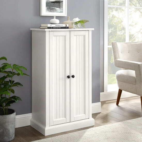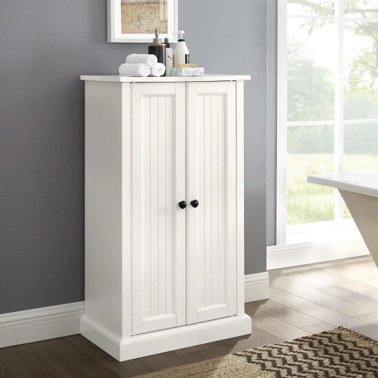 Organize your items in charming coastal style with the Seaside cabinet from Crosley Furniture. The distressed white MDF frame features double doors with beadboard paneling for a traditional look. Four adjustable shelves allow you to easily customize your storage needs.