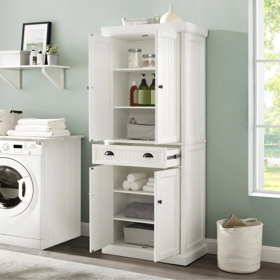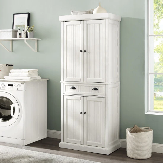 Evoke the feeling of sun and sea with this utterly charming kitchen pantry. Constructed from solid hardwood and veneers, the weathered surface softens the classical lines and suits any home. A deep, easy-gliding drawer separates two large cabinets with magnetic closure doors and adjustable shelving inside. With genuine metal hardware and slatted details, kitchen clutter can be kept at bay in one handsome pantry.