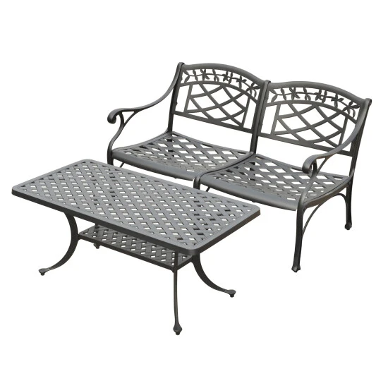 It may be hot outside, but you’ll feel cool kicking back in our heavy duty, solid-cast aluminum furniture. Designed for style and built to last, this outdoor conversation seating set features a durable charcoal black powder coated finish that will weather the harshest of outdoor conditions. Experience pure nirvana while unwinding in the chair’s comfortable contoured seats. Your very own outdoor oasis awaits you.