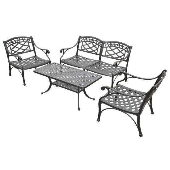 It may be hot outside, but you’ll feel cool kicking back in our heavy duty, solid-cast aluminum furniture. Designed for style and built to last, this outdoor conversation seating set features a durable charcoal black powder coated finish that will weather the harshest of outdoor conditions. Experience pure nirvana while unwinding in the chair’s comfortable contoured seats. Your very own outdoor oasis awaits you.