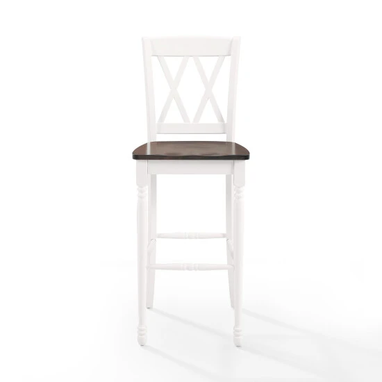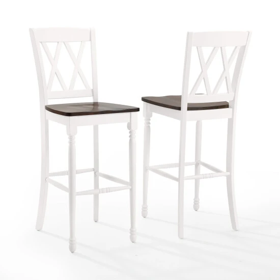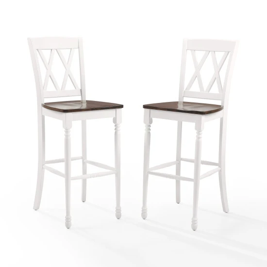 Classic seating goes to the next level with the Shelby 2pc Bar Stool Set. Beautifully crafted with a molded wood seat and double x design on the back, this stool set is a perfect addition to a breakfast bar or bar height dining table. With traditional turned front legs, the Shelby 2pc Bar Stool Set adds charm and function to your kitchen or dining space. – Traditional design – Rubbed white finish – Contoured wood seat with a cherry finish – Classic turned front legs – Double X design on back – Stools can be used with bar height tables and kitchen islands – Four solid hardwood leg stretchers for durability – Pairs well with rustic and farmhouse decor
