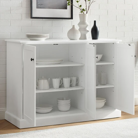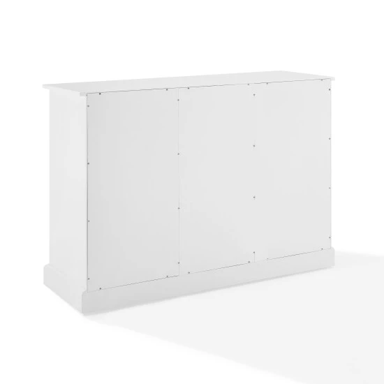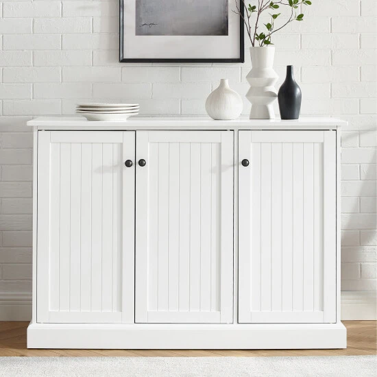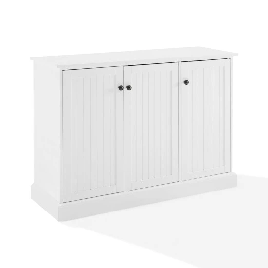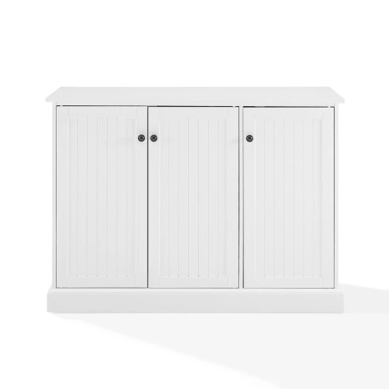 Featuring charming beadboard details, the Shoreline Sideboard adds a dash of coastal flair to your dining room or kitchen. This sideboard has a large top for serving and a dual cabinet design for ample storage. Add the Shoreline Sideboard to any room of your home and get organized in style.Features:Coastal designWhite finishGenuine metal hardware with a bronze finishBeadboard paneling on doorsCabinet doors have magnetic closuresTwo adjustable and removable shelves in each cabinet with a 15lb weight limit per shelfPairs well with traditional and farmhouse decorSideboard top weight limit is 100lbs