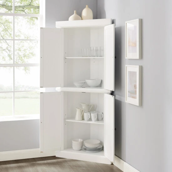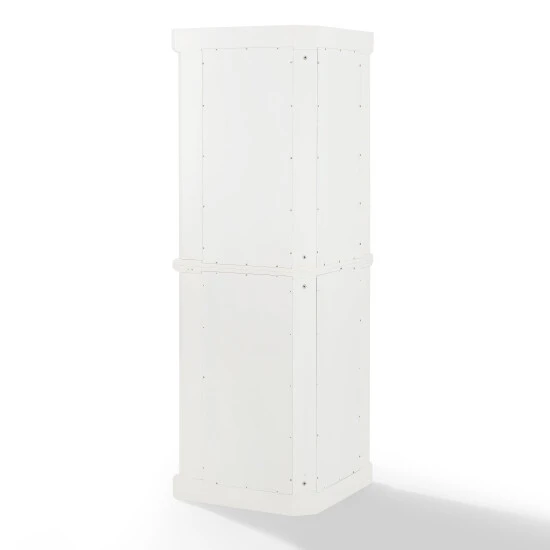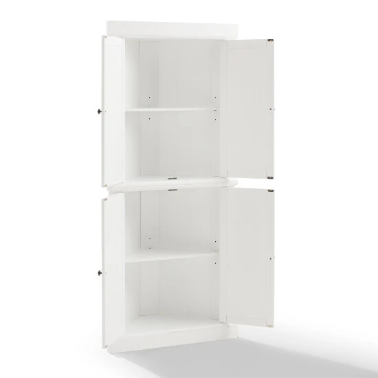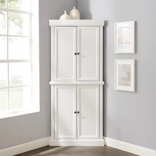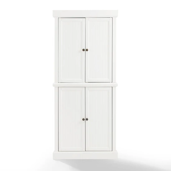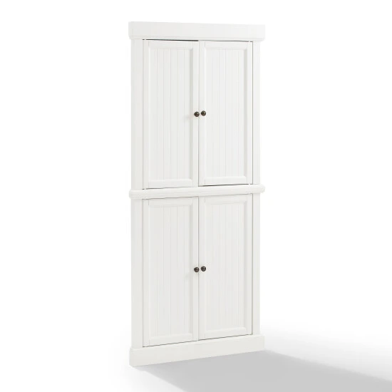 With charming beadboard details, the Shoreline Pantry provides a dash of coastal flair to home organization. Comprised of two identical stackable pantries, this set is connected with a sturdy metal plate, offering ample storage without taking up valuable floor space. Ideal for smaller rooms, the Shoreline Tall Corner Pantry offers adjustable shelving and is designed to tuck neatly into any corner of the home.Features:Coastal designWhite finishGenuine metal hardware with a bronze finishBeadboard paneling on doorsCabinet doors have magnetic closuresEach cabinet has an adjustable and removable shelf with a 15lb weight limit per shelfIncludes metal plate for stacking two units togetherCan be used in a bathroom, home office, or kitchenPairs well with traditional and farmhouse decor
