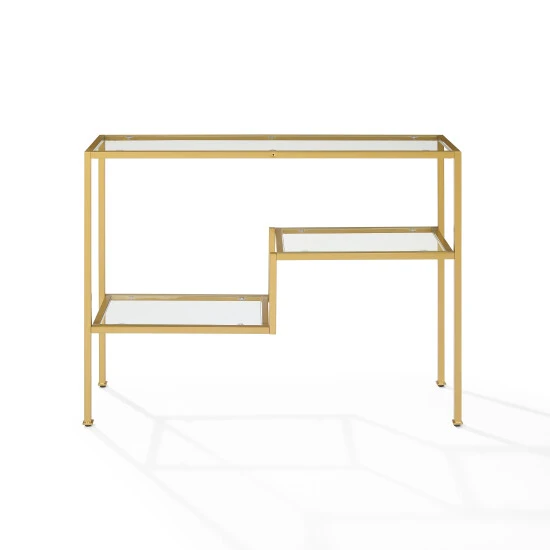 Modern simplicity is the hallmark of the Sloane Console Table. Ready to display your favorite books or decor, this console table’s sculptural steel frame features sturdy tempered glass shelves. Variable shelf heights create a geometric design with Art Deco flair, making this console table a beautiful addition to your living room or entryway.Features:Art Deco inspired designFrame is constructed of sturdy steelGold finishTempered glass top with a 25lb weight limitTwo tempered glass shelves each with a 20lb weight limitVariable shelf heightsAdjustable levelers on legsModular design allows multiple units to be paired togetherPairs well with modern and glam decor