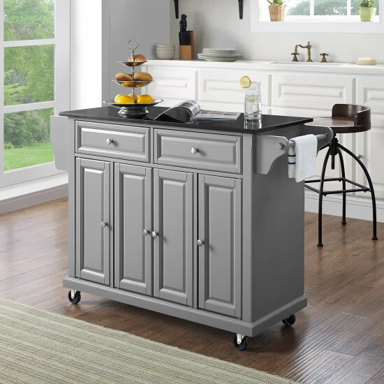 Constructed of solid hardwood and wood veneers, this mobile kitchen cart is designed for longevity. The beautiful raised panel doors and drawer fronts provide the ultimate in style to dress up your kitchen. Two deep drawers are great for anything from utensils to storage containers. Behind the four doors, you will find adjustable shelves and an abundance of storage space for things that you prefer to be out of sight. The heavy duty casters provide the ultimate in mobility. When the cabinet is where you want it, simply engage the locking casters to prevent movement. Style, function, and quality make this mobile kitchen cart a wise addition to your home.