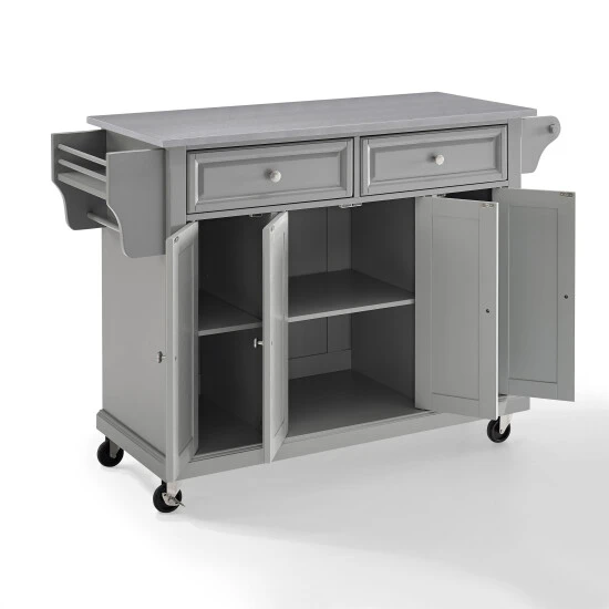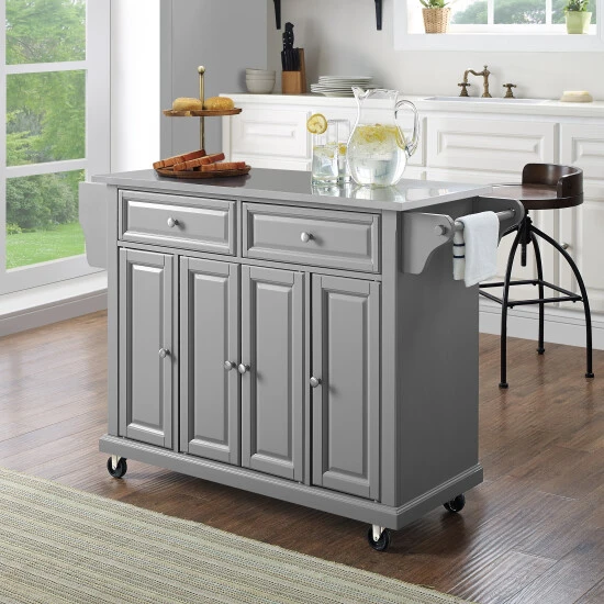 Add prep space to your kitchen with this mobile cart with locking casters. Designed for longevity, the island is crafted from solid hardwood with vintage grey finish wood veneers and a stainless steel top, and features four cabinets and two drawers with panel-front detailing. The six interior shelves are perfect for storing your kitchen supplies, while the towel rack and end shelf allow easy access to your essentials.