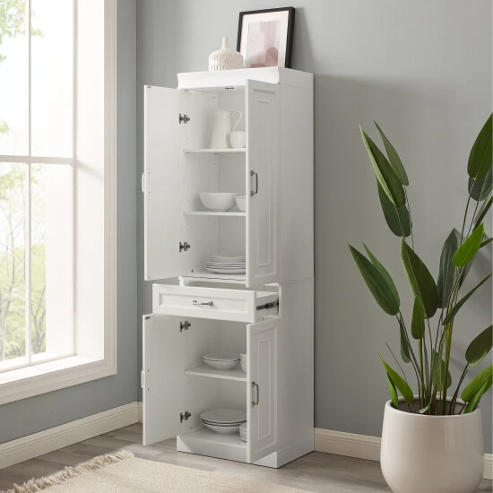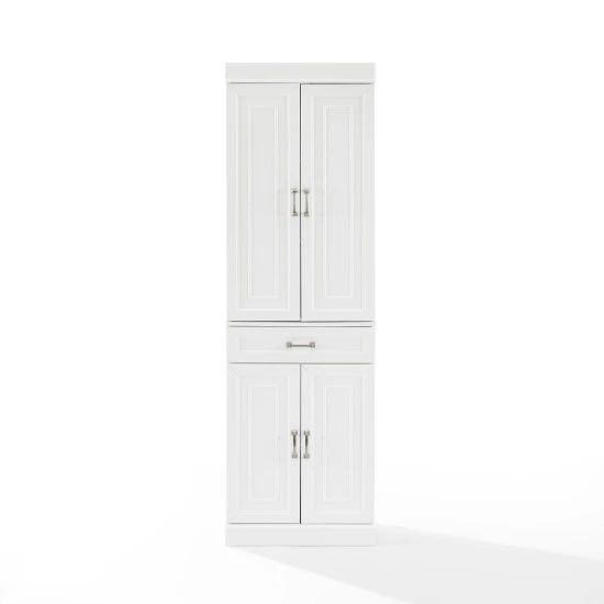 The Stanton Pantry combines classic styling with the versatility of modular design. Featuring adjustable shelves in the lower and upper cabinets plus a full-extension drawer, this pantry is great for home organization. Panel doors on the cabinets keep everyday items out of sight, while the modularity of the Stanton pantry allows it to mix with other items in the collection for customizable storage.Features:Traditional designWhite finishGenuine metal hardware in a brushed nickel finishTwo large cabinets with double doors, magnetic closures, and concealed hingesTwo adjustable and removable shelves in upper cabinet with a 15lb weight limitAdjustable shelf in lower cabinet with a 15lb weight limitKFull-extension storage drawer on ball-bearing glides with a 15lb weight limitRecessed paneling on cabinet doors and drawer frontKIModular design allows multiple units to be paired together or with other items in the collectionPairs well with modern farmhouse decor