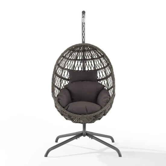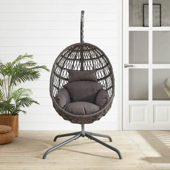 Indulge in the cozy bohemian style of the Tess Hanging Egg Chair. With all-weather rattan wicker over a steel frame, this chair is great both indoors or outside. Featuring a tufted cushion and durable steel stand, the Tess Hanging Egg Chair is a perfect hideaway for relaxation.Features:Bohemian designDurable powder-coated steel chair frame and standDriftwood all-weather resin wickerTufted cushion covered in gray polyester fabricDesigned for indoor or outdoor useChair has a weight limit of 250 lbs