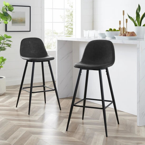 With a sleek silhouette and modern design elements, the Weston 2pc Counter Stool Set is a unique addition to your dining or kitchen area. Durable and comfortable, this stool is upholstered in high-quality faux leather and sits atop tapered steel legs. Add the Weston counter stools to a kitchen island or breakfast bar for an instant dining upgrade.Features:-Modern design -Distressed faux-leather upholstery -Sturdy steel legs in a matte black finish-Tapered legs-Adjustable levelers on legs -Slope stye bucket seat -Rounded footrest -Easy assembly -Pairs well with modern farmhouse, rustic, industrial, and mid-century modern decor